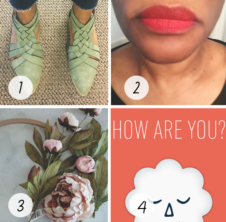 [1] Journee Savannah Flat // I’m loving my new shoes. They are surprisingly comfortable, and I’ve had a hard time this year trying to find cute shoes I can walk in. [2] I can’t remember the last time I wore a red lip, but every now and then I like to wear something besides lip gloss or lip butter. This NYX Liquid Suede Cream is in the color Kitten Heels. [3] Our hallway renovations are almost complete so now I can’t complete my Spring/Summer Wreath. [4] I’ve been using this new meditation app called Breathe. This is a landing screen and you start by checking in, and then you can choose a session to help improve your day.