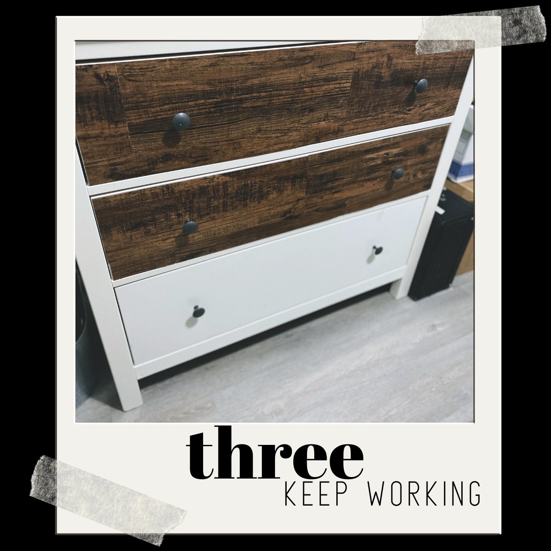 I want to reface the drawers with vinyl plank flooring to give this little dresser a rustic finish. Changing out the knobs and reinforce the bottoms so it’s more sturdy will be the final step. So far, I have no plans for the top, because I like that smooth surface.