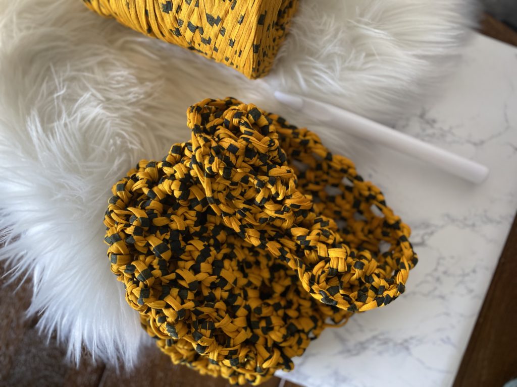 I’m also using t-shirt yarn vs. regular wool because it’s warm outside and I don’t think wool is particularly kind to natural hair. Thus my scarf is 100% cotton. Any type of yarn will do but if it’s going to be against your skin it’s best to make sure the fabric isn’t scratchy.