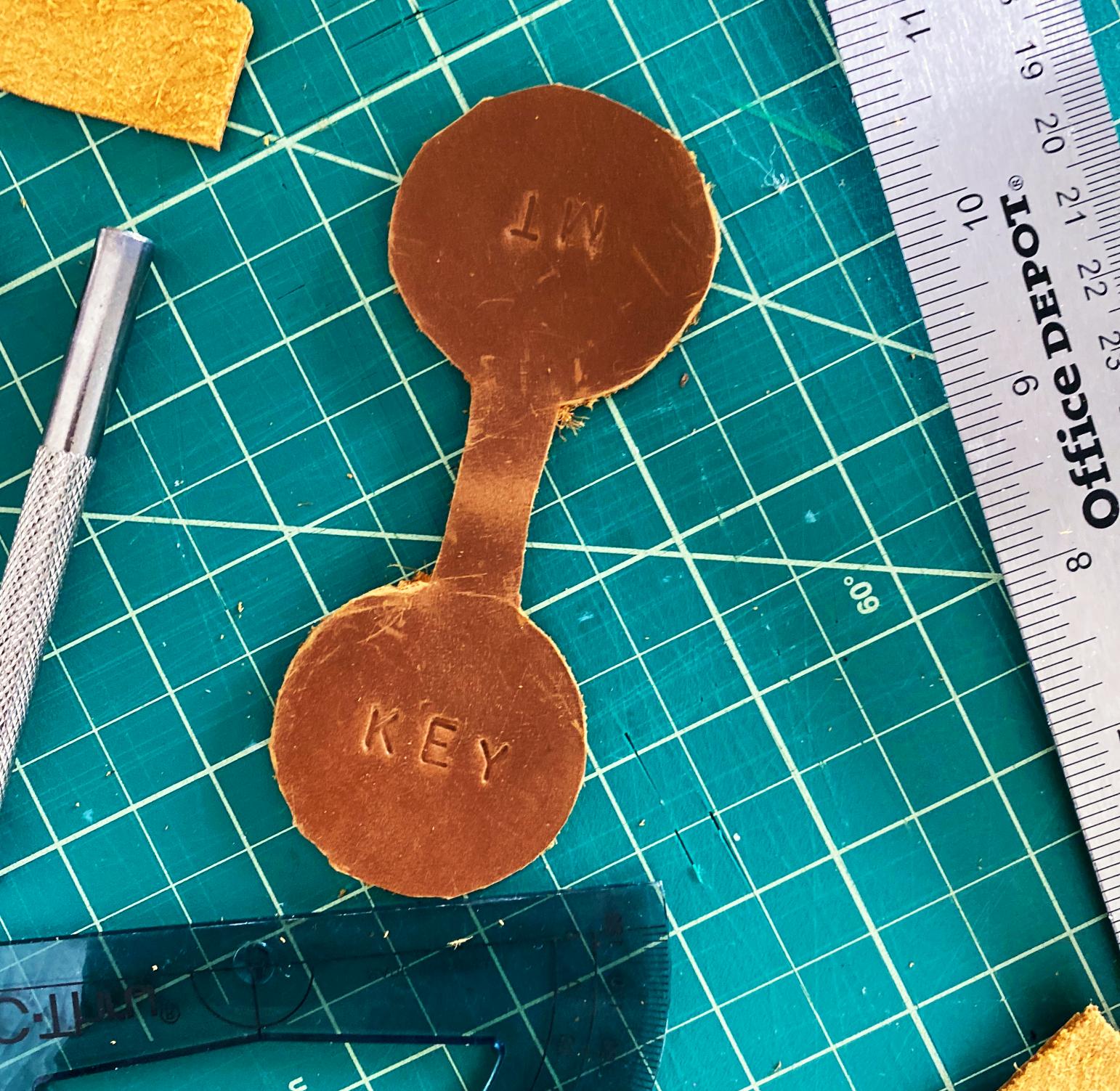 After cutting it was time to stamp the letters. What I learned, is that a regular ole hammer works best on thick leather, my first try I used the rubber mallet, and as soon as I glued my shape, the letters disappeared into it.
