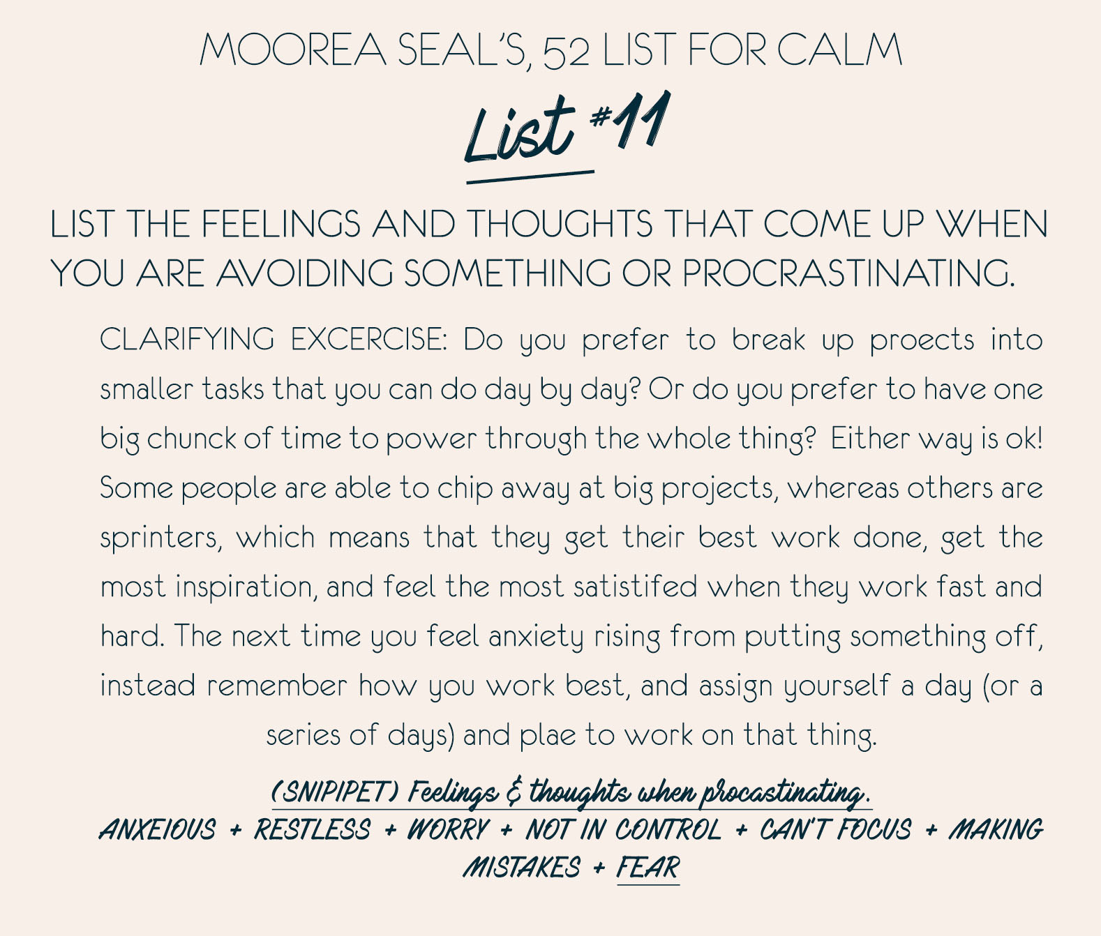 List #11 is a CLARIFYING EXERCISE which walks you through the anxiety you feel when you procrastinate or put things off that need to get done. In this exercise, I’m a “fast-and-efficient-pace individual. That’s always been the way that I work best. I want to power through and get it done.