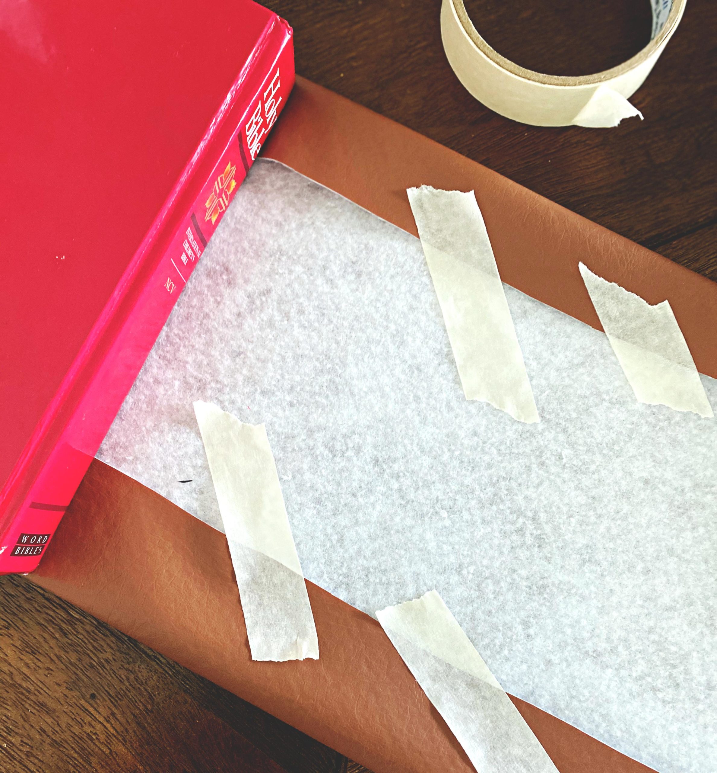 I measured out the faux leather fabric to the size of my book but leaving enough for a flap. Once everything is measured out, I made a pocket. This is where the front of the Bible will sit. Since there is no space to string this book from the spine (which is what Dream A Little Bigger blog recommends). I’m creating this pocket so that the cover won’t wiggle around.