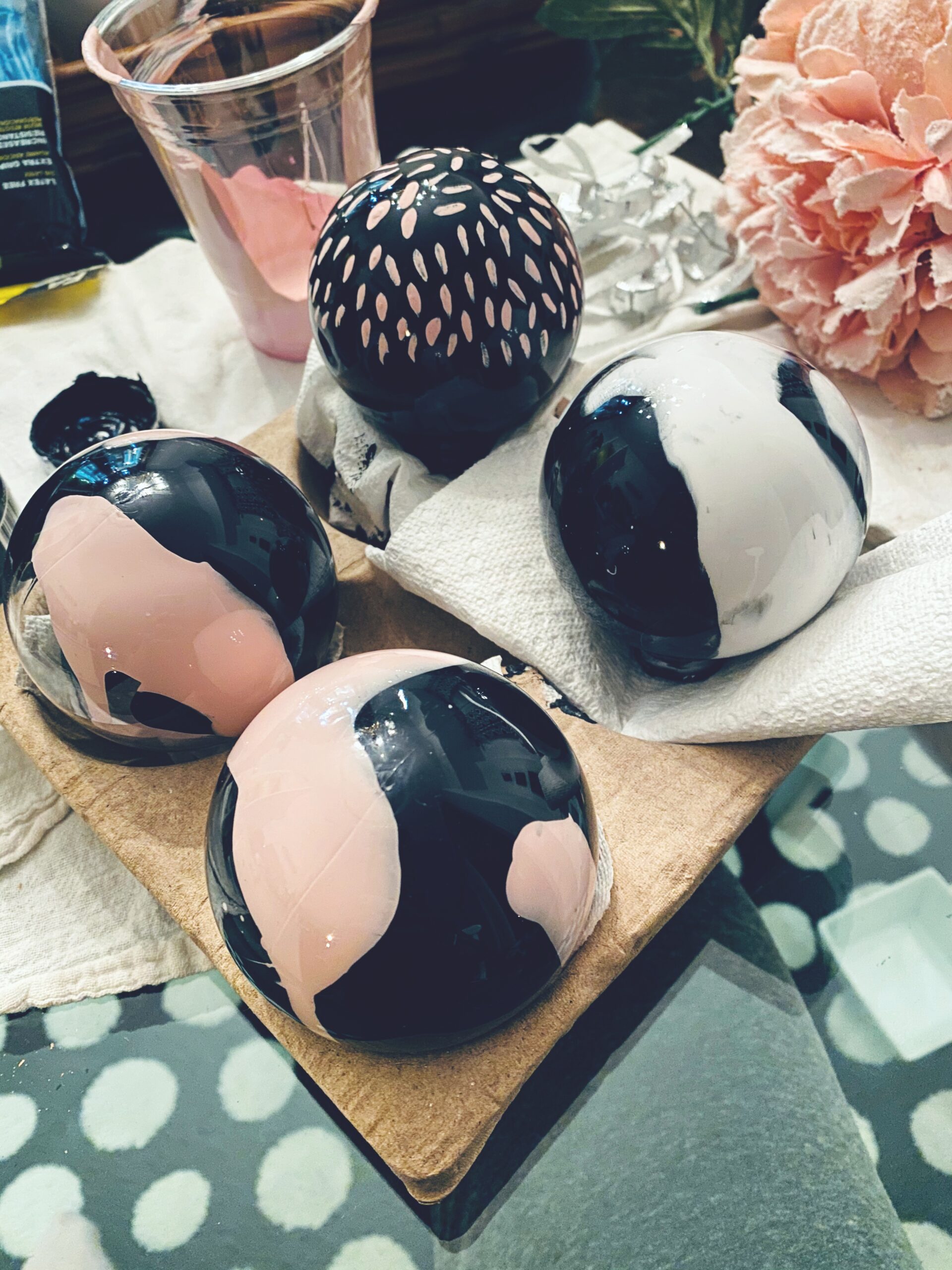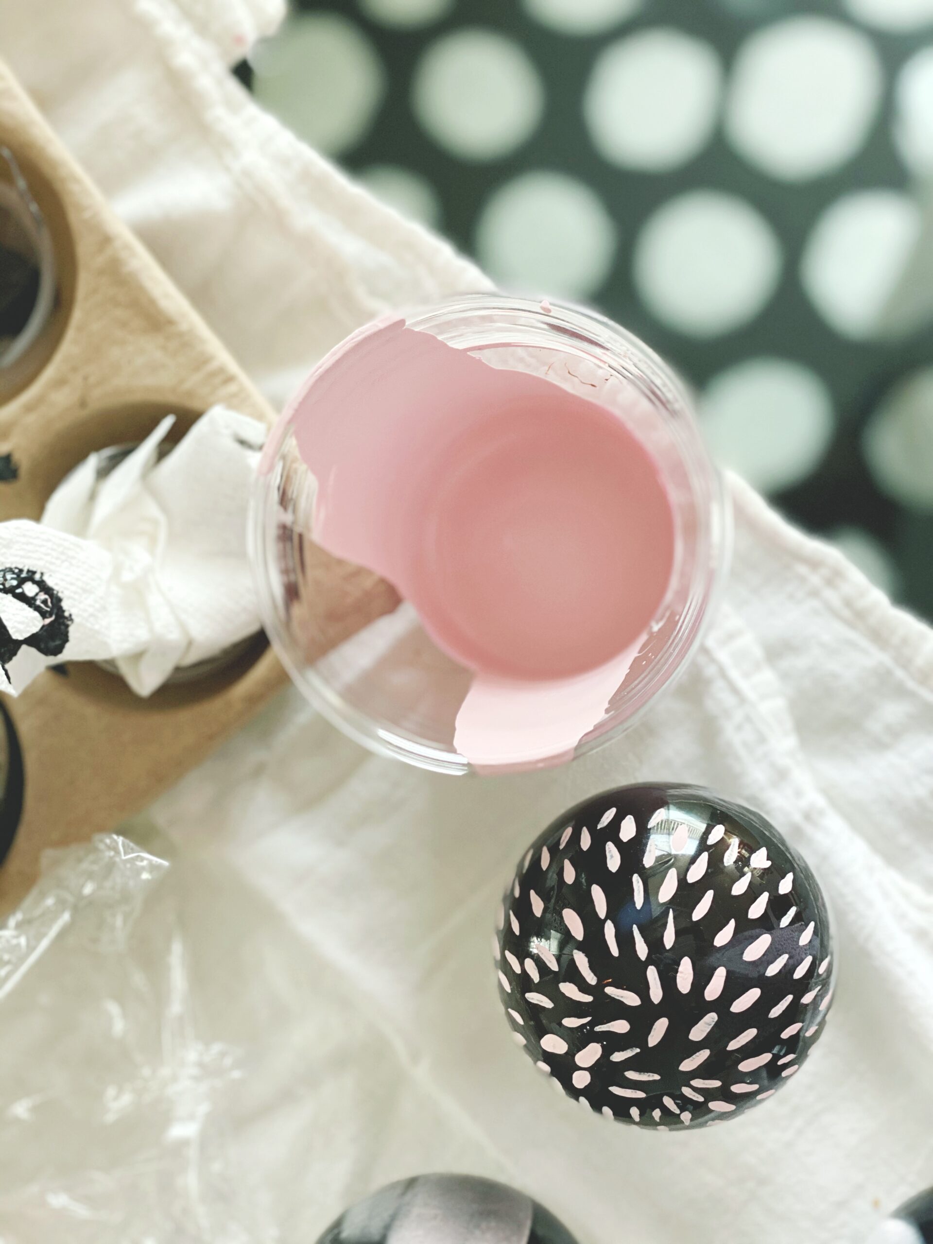 NEXT TIME: I’ll remember to add a little water to your acrylic paint so it’s a little runny. It took A LOT of shaking to cover the bulb. The one that I didn’t marbleize I added little flecks in pale pink.