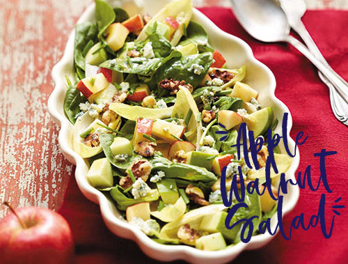 - In a large bowl, mix the apples, spinach, endive, walnuts, and blue cheese.