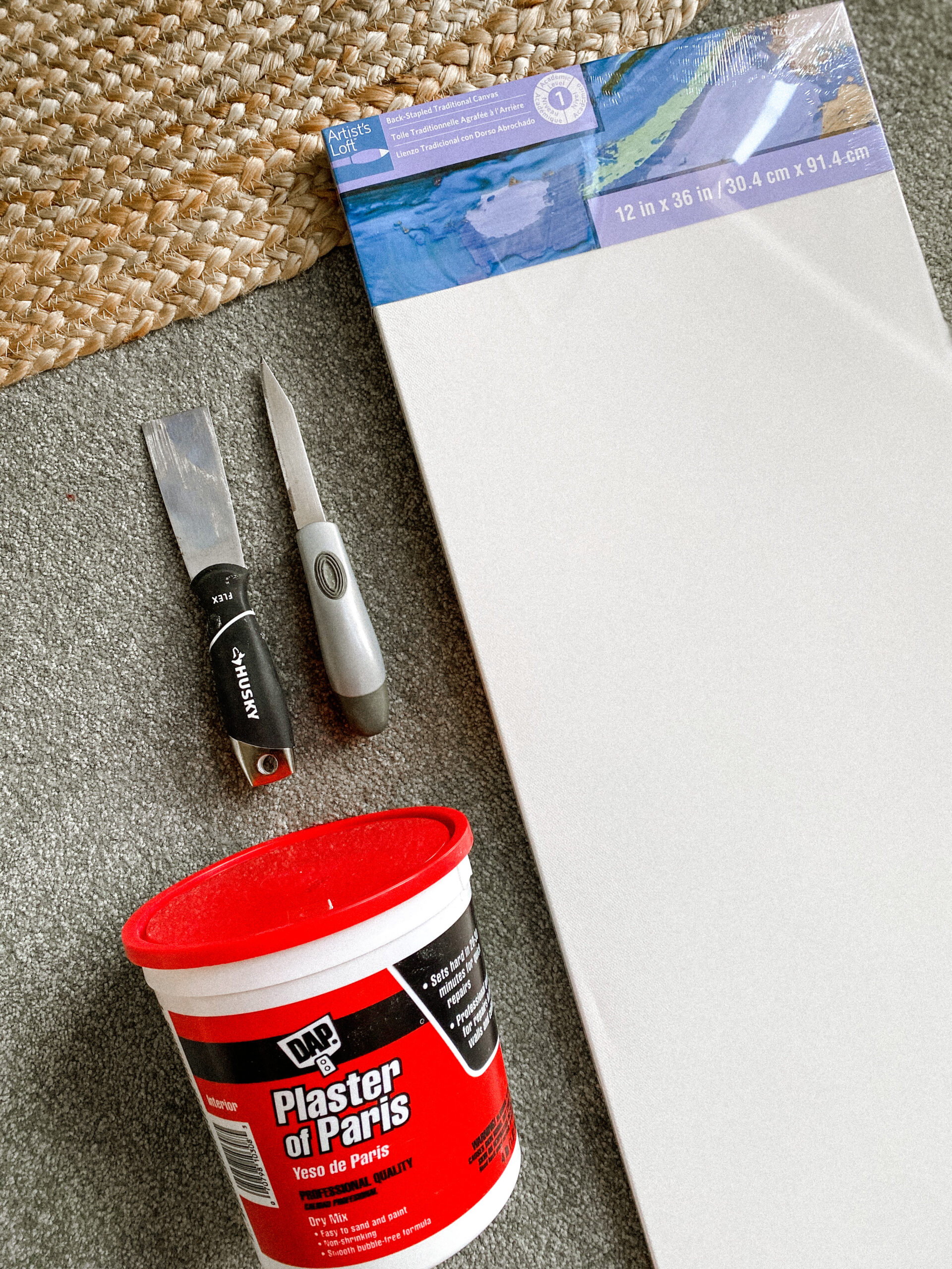 For several weeks I researched working with plaster, to create a type of mixed media project on canvas. After I was comfortable that I could do this project I wanted to get a tall canvas because my ceilings are over 10 feet.