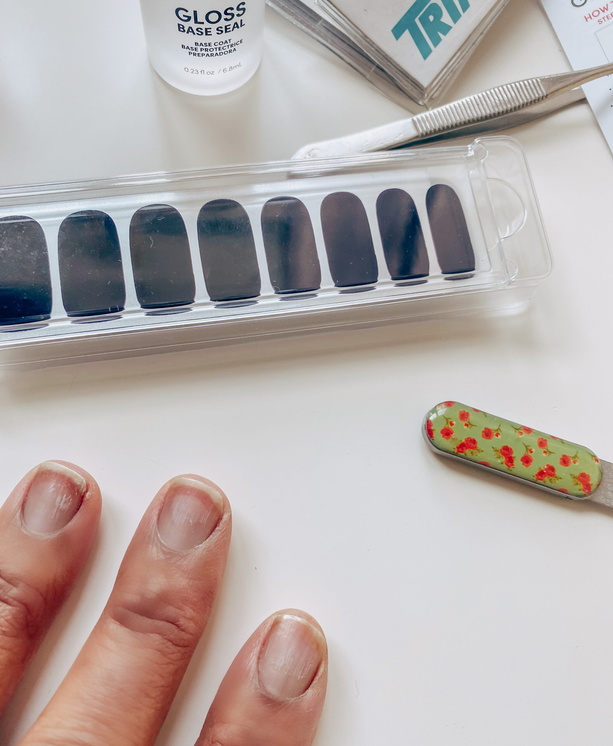 There is a nifty video on their site that shows you how to apply your nail, but there are also directions in each nail kit (which I appreciate). You first wash your hands, file down your nails, push back your cuticles, and then size the desired strip to your nail size. I also used the recommend Red Therapy Base Seal for Gloss, (which prepares the nail for the strip) then I peeled the nail from its backing, applied it to my nail, and pressed it down in all directions as recommend.