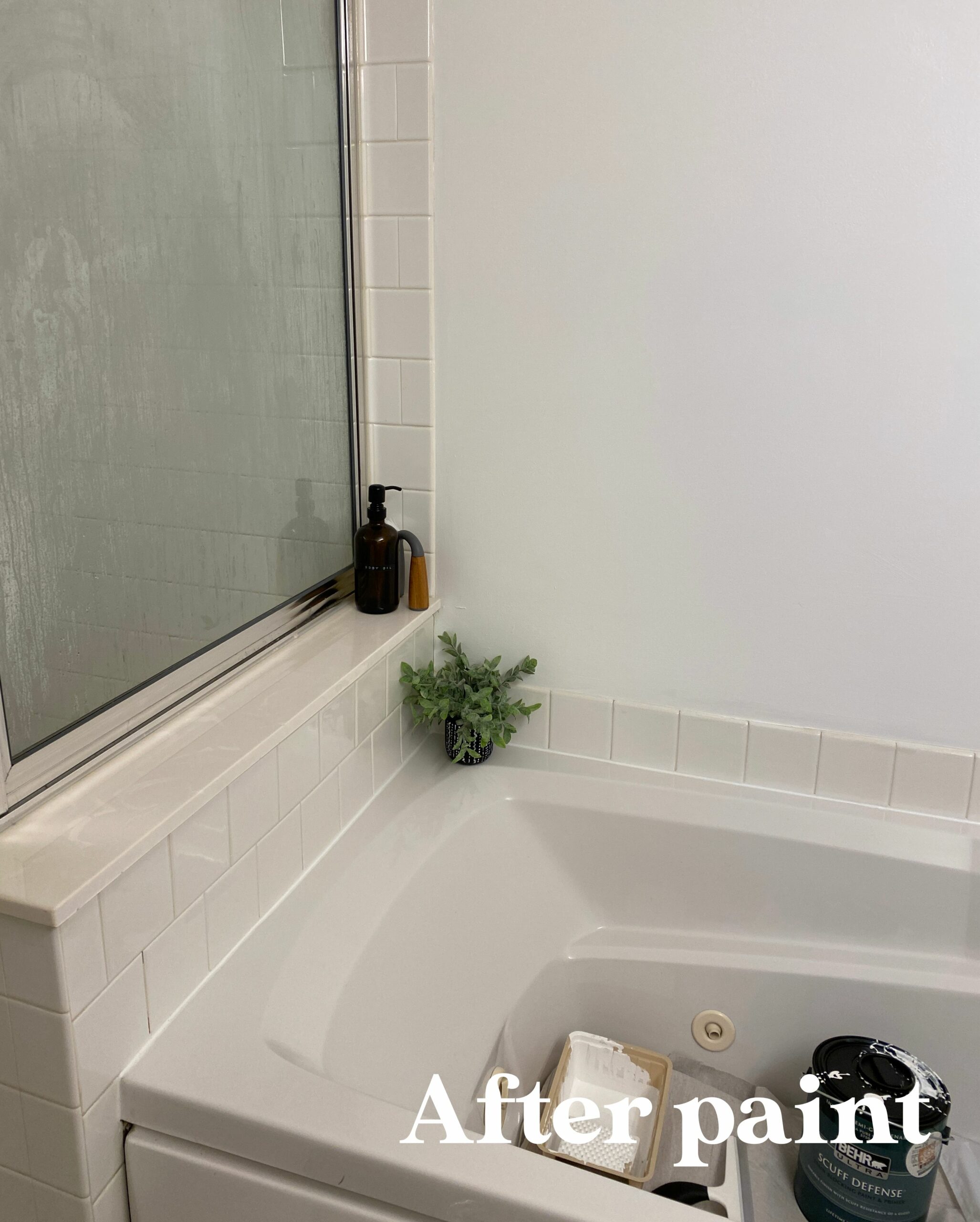 My bathroom is large (this is one side of it), and something I wasn’t used to. It’s a cavernous sea of white, off-white, something like white, and beige or almond. The tub is cream, the countertop is cream, the floor tile is tan and the walls…I don’t even know what color that was. Moreso than the color whomever (I’m gonna assume the owner) used a flat, matte paint for a bathroom, with no windows.