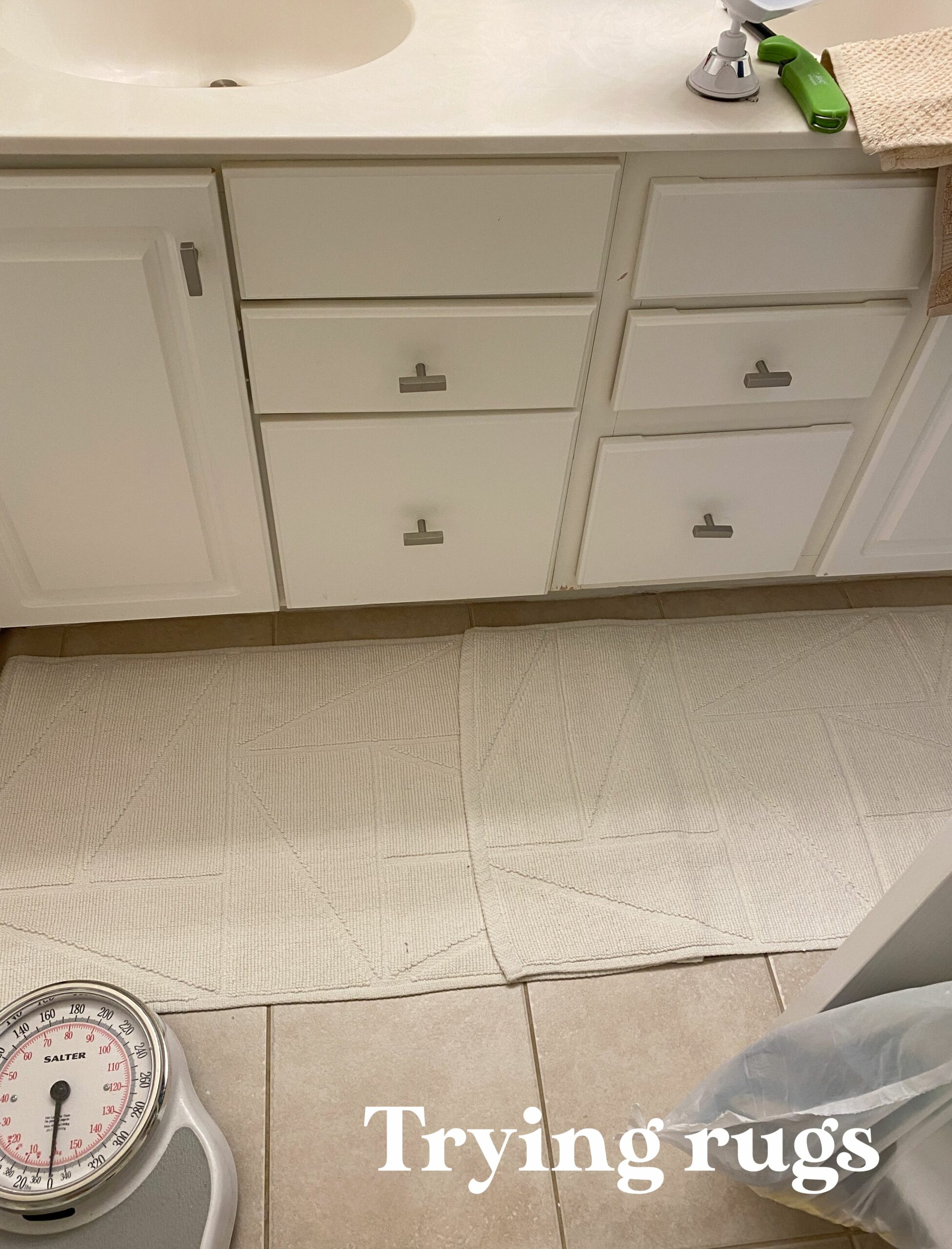 I also (initially) added brushed nickel drawer pulls, because the original stuff was a little round knob that was (you guessed it) another shade of white. After sitting with this for a few months, the nickel finish is so dull, and because my vanity is SUPER low, I’m always bumping into those pulls, so I’m going to change the drawers to a larger knob, replace the existing one with a black.