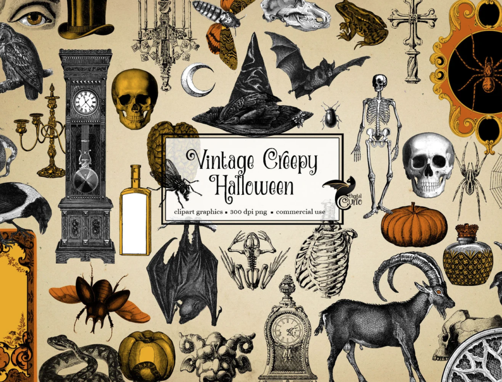 Digital Curio is another great artist on Etsy. This is a set of 44 vintage creepy graphic elements – perfect for your creative designs. Each image is packed as a high resolution PNG (300 dpi) of each individual image with transparent background. Bats, skulls, skeletons, pumpkins, spiders, and other spooky illustrations make this a complete kit for your Gothic or Halloween projects. Coordinating seamless digital paper is available separately!