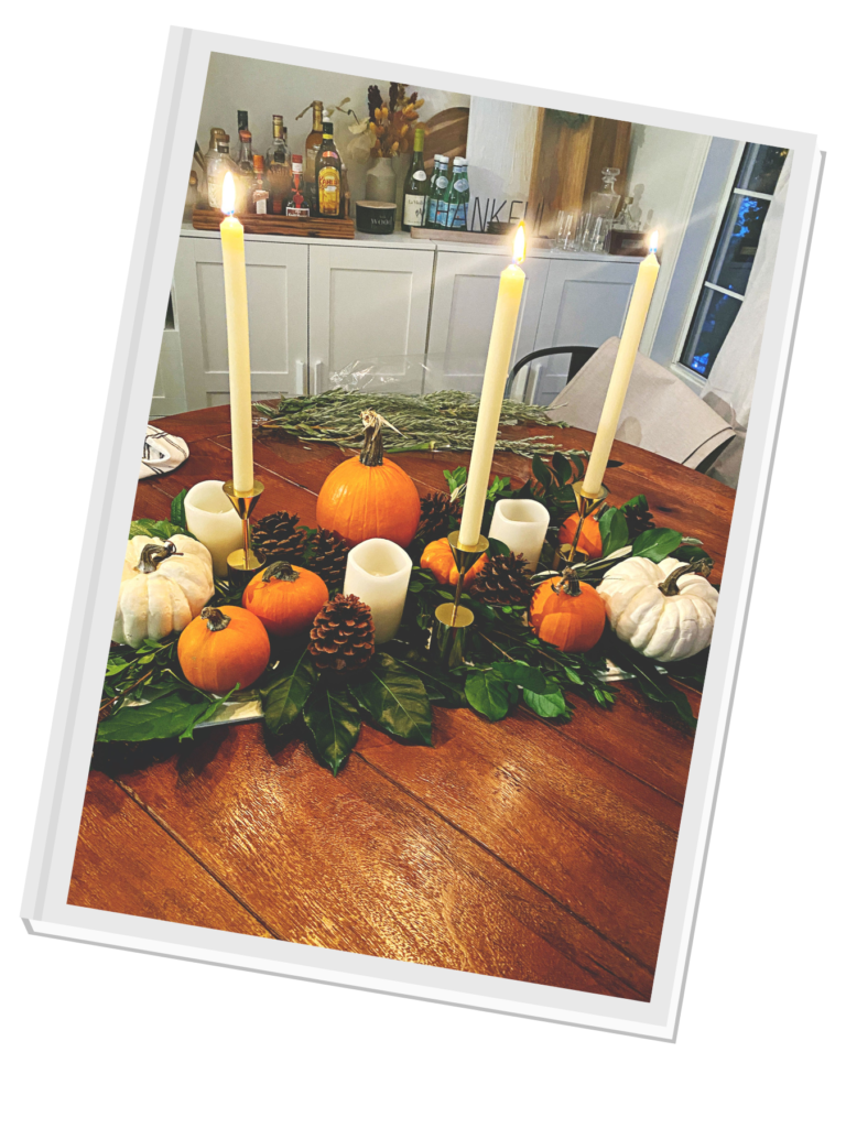 I did a really simple table with candles, only two faux pumpkins, some mini pumpkins from the patch and flower filler from the grocery store. Underneath is a table runner because the flower filler was live. I also used a few faux stems that I got from Joann’s in September to put between the napkin and the bowl.