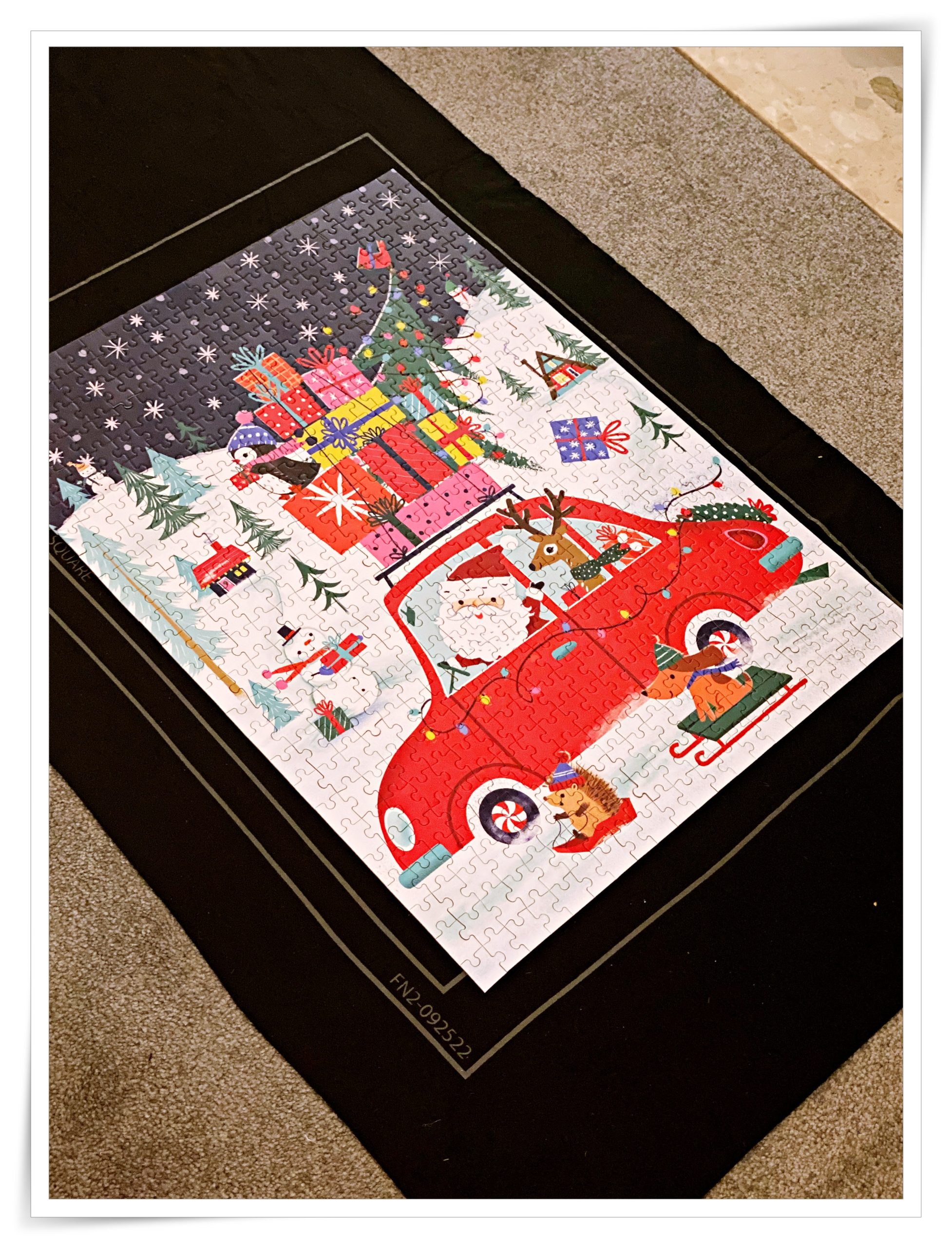 We finished the “Dashing All the Way Puzzle” in 3 days. Granted it was a 550-piece puzzle and not a 1000-piece, and because there were color variations it went quickly.