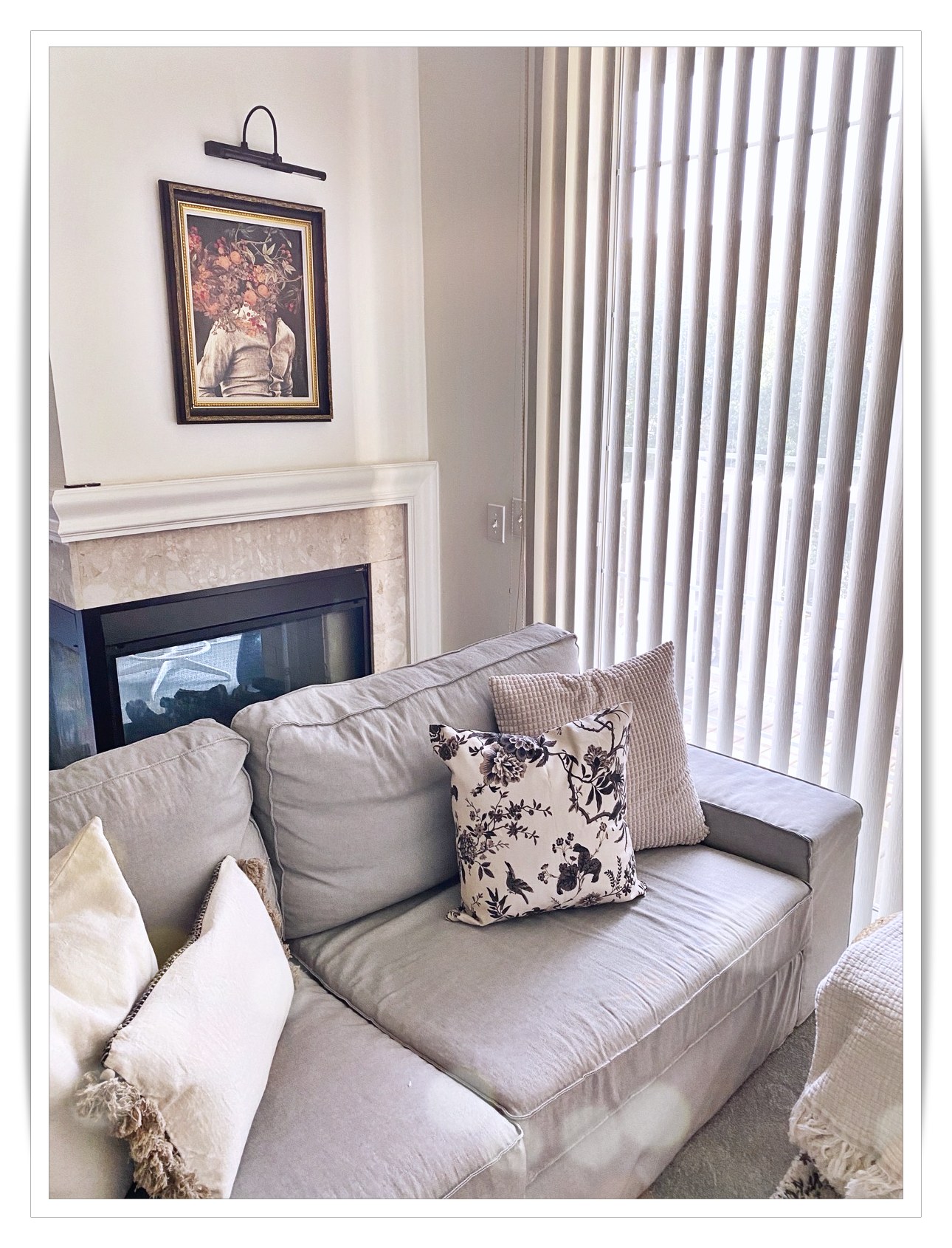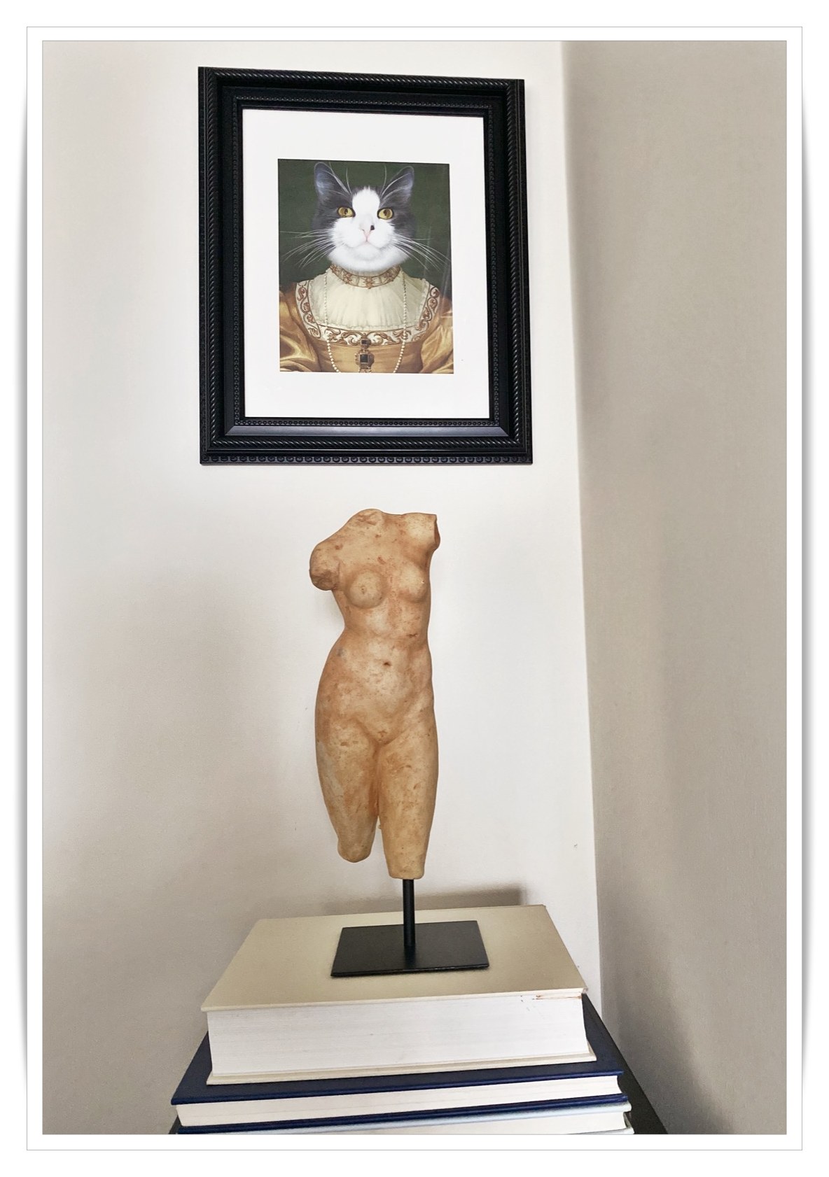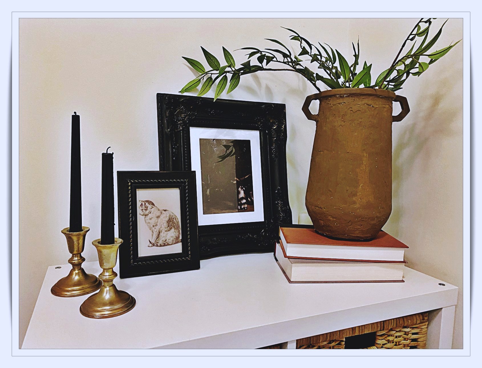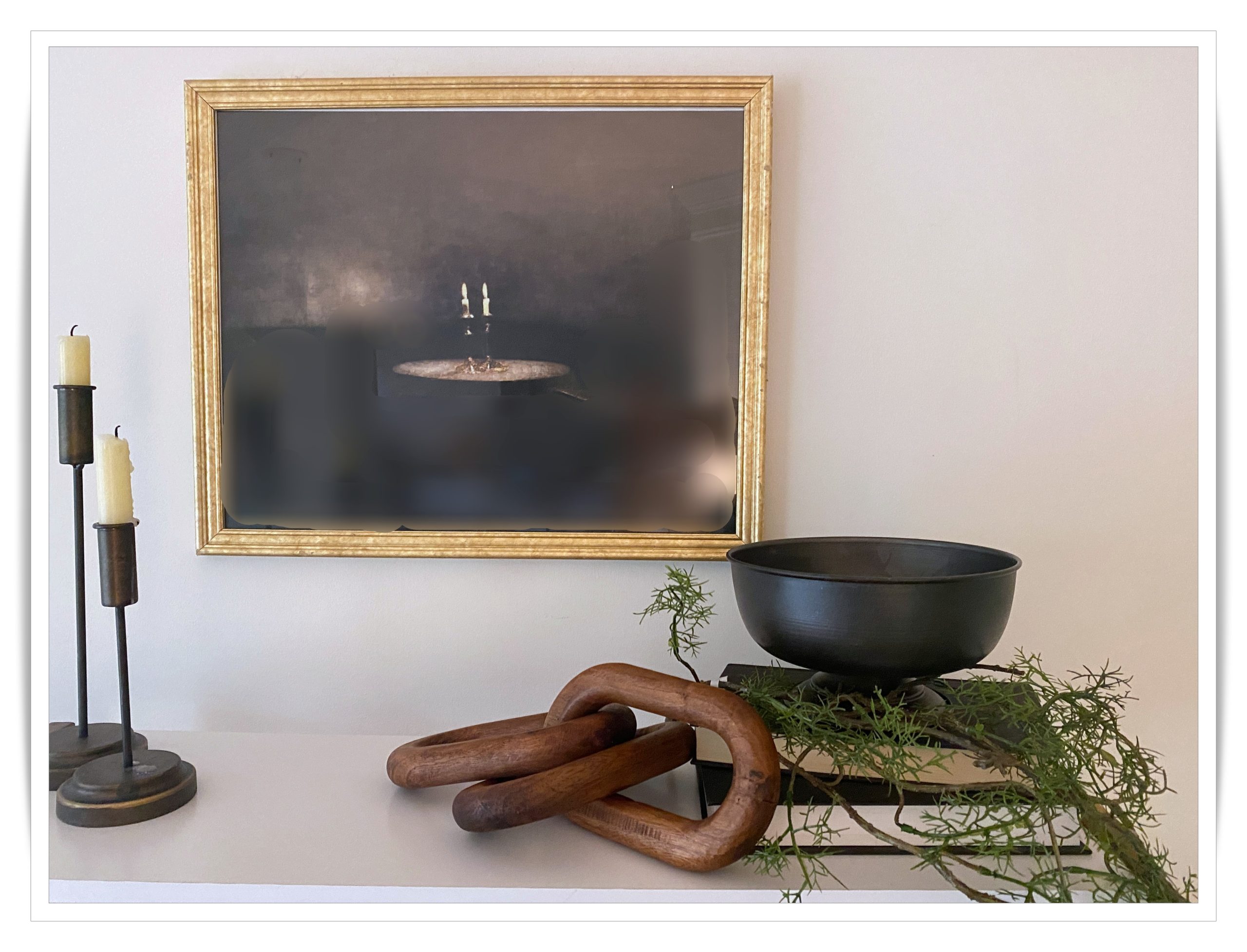 NOTES: All my picture frames are thrifted and upcycled with matt black paint and rub’n’buff. The only new addition is the greenery, the female statue, and the art light. The brass knot, pillow covers, wooden chain, books, and candle holders are a combination of thrifted and store-bought items. However, I’ve had everything for at least 3 years, and this classic decor can be used and re-used for any season.