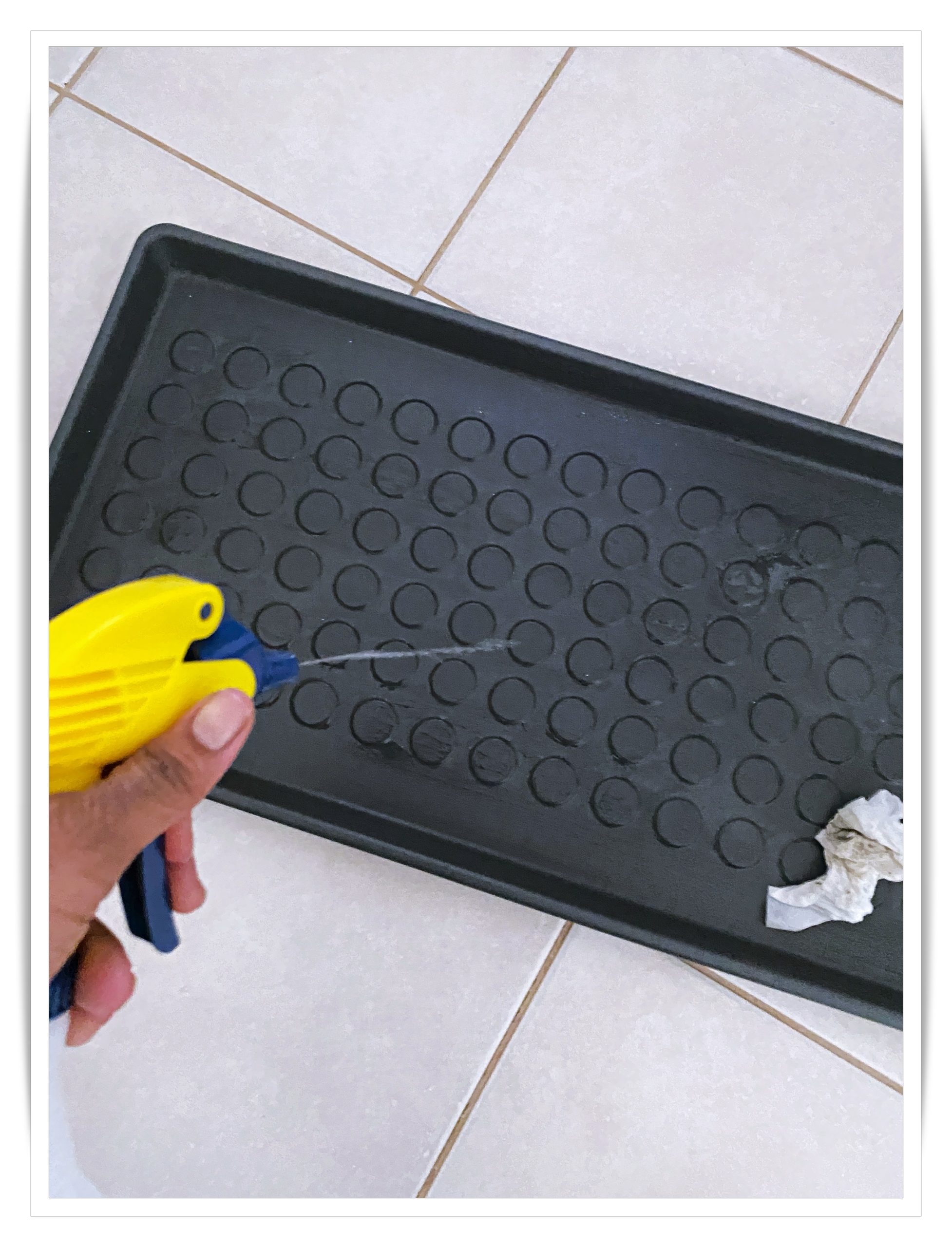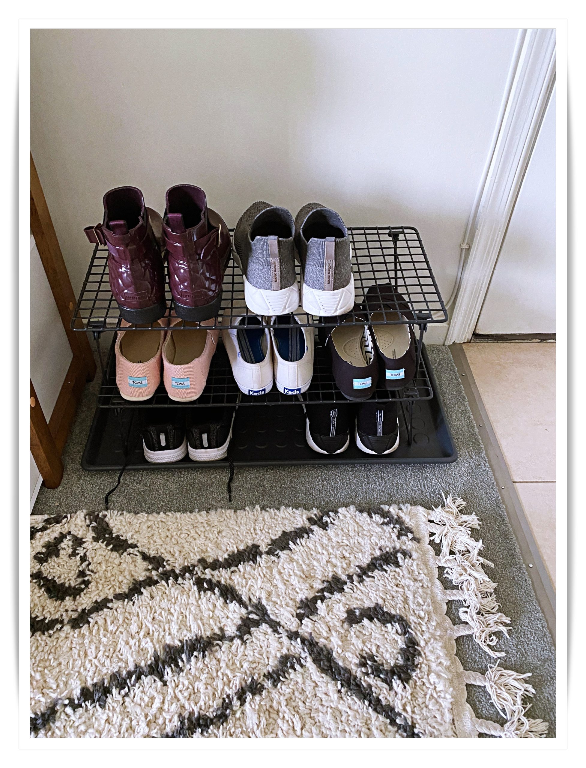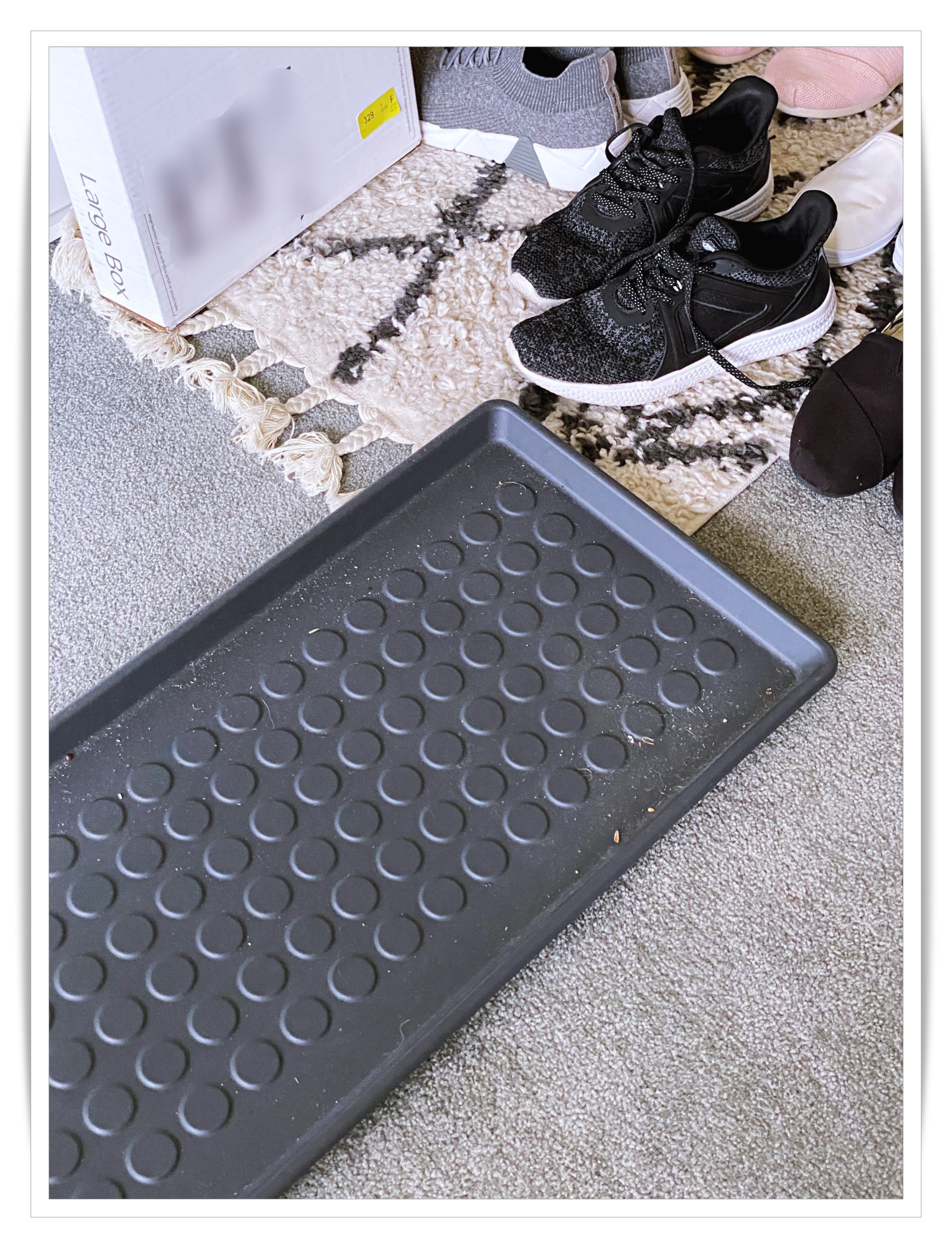 So my first task was to clear it out, sweep and mop. Right next to the entry, we keep our everyday shoes, and the bottom tray was really dirty from what’s on the bottom of our shoes. So cleared everything off, wiped the bottom part of the shoe tray, and took away all the winter shoes.