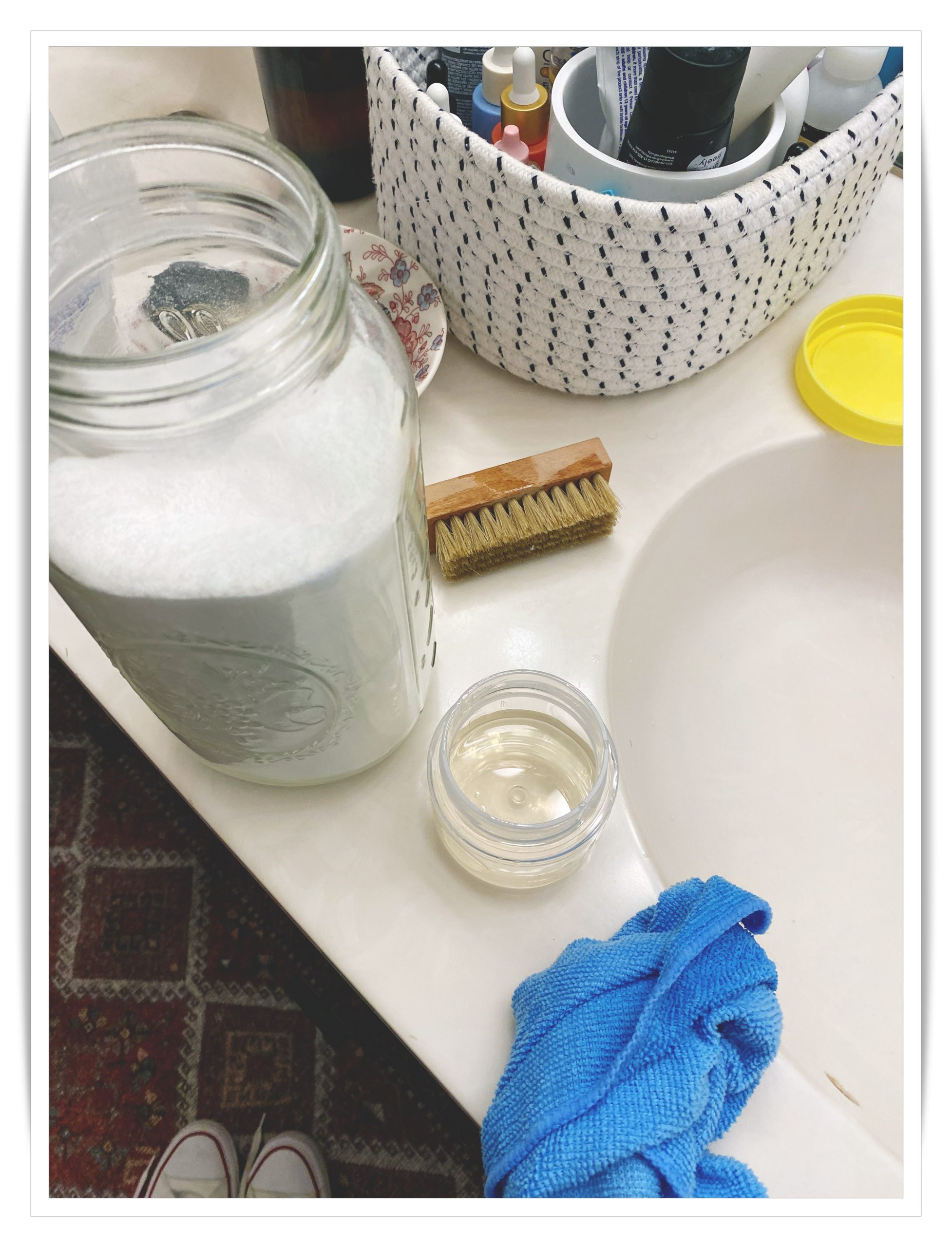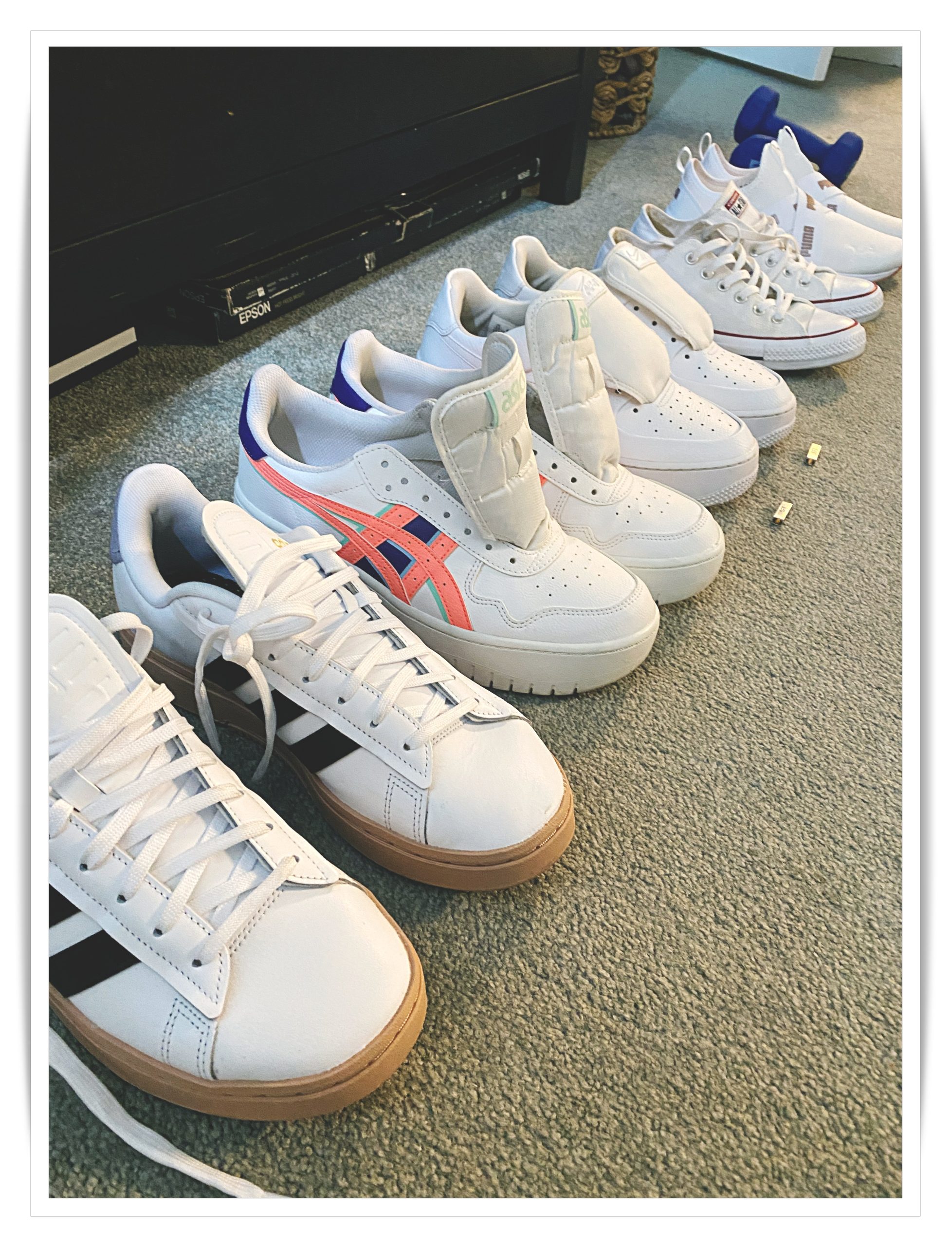 All my sneaks, with the exception of the Adidas, are a minimum of one year old. While I was cleaning those, I decided to clean the rest. I just used some Borax [it’s magic], a wooden brush, laundry detergent, and a cleaning cloth. I also washed laces on two pares, so now I’m good to go until the end of the year, with the exception of spot cleaning.