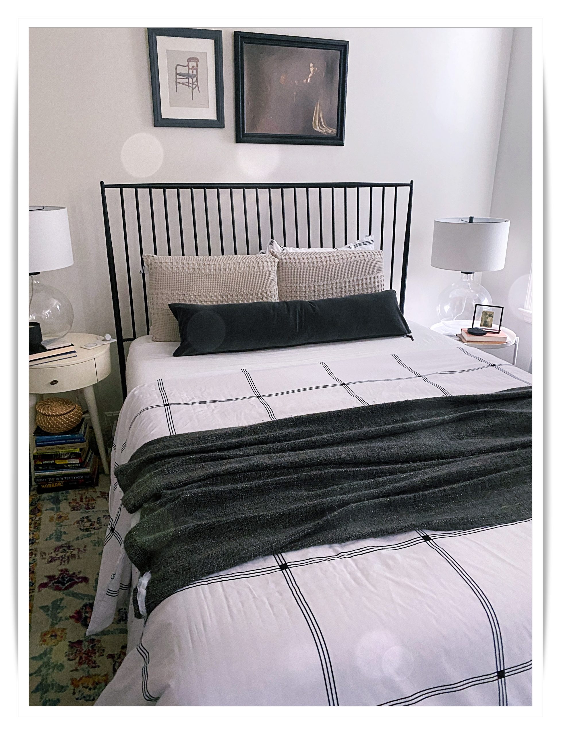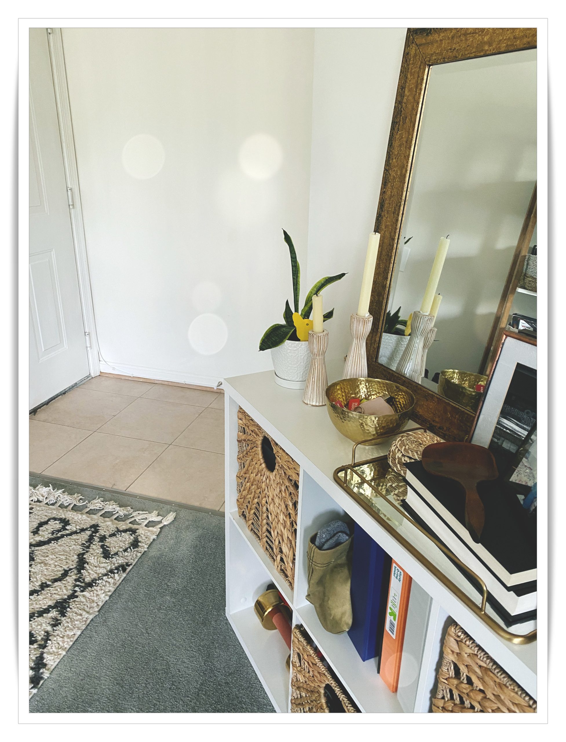 THE ENTRYWAY (If you want to call it that) is just that. It’s not grand or prominent. It’s just a small rectangular space with no features, but since I moved here, it’s always had something on the floor. A basket, our shoes, umbrellas, or just something.