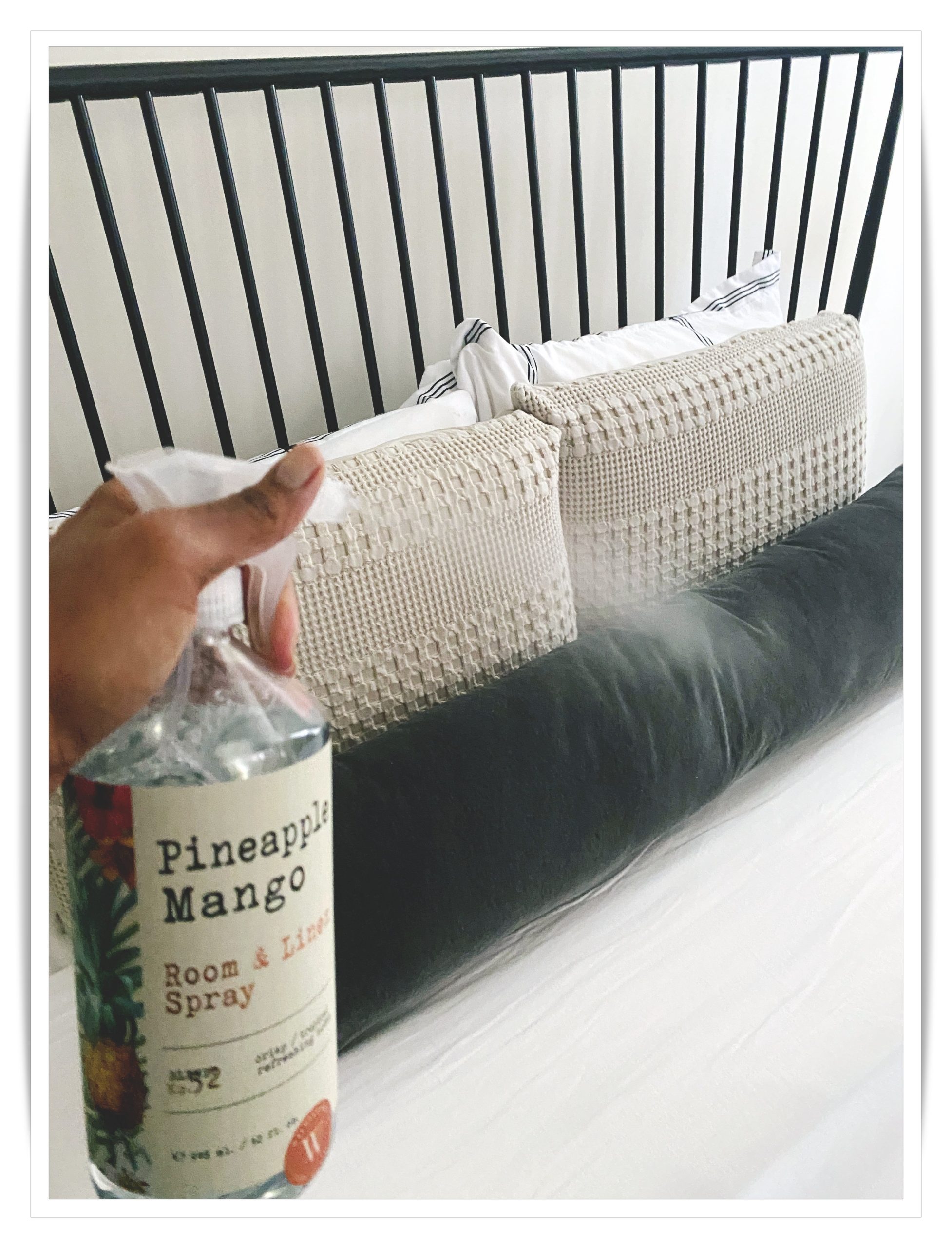I also love spraying my linens and sofa cushions year-round. I found this Pineapple Mango scent at TJ Maxx, and during the fall, I use a white pumpkin scent. But my favorite is a winter holiday scent that smells like trees from Abby Sullivan.