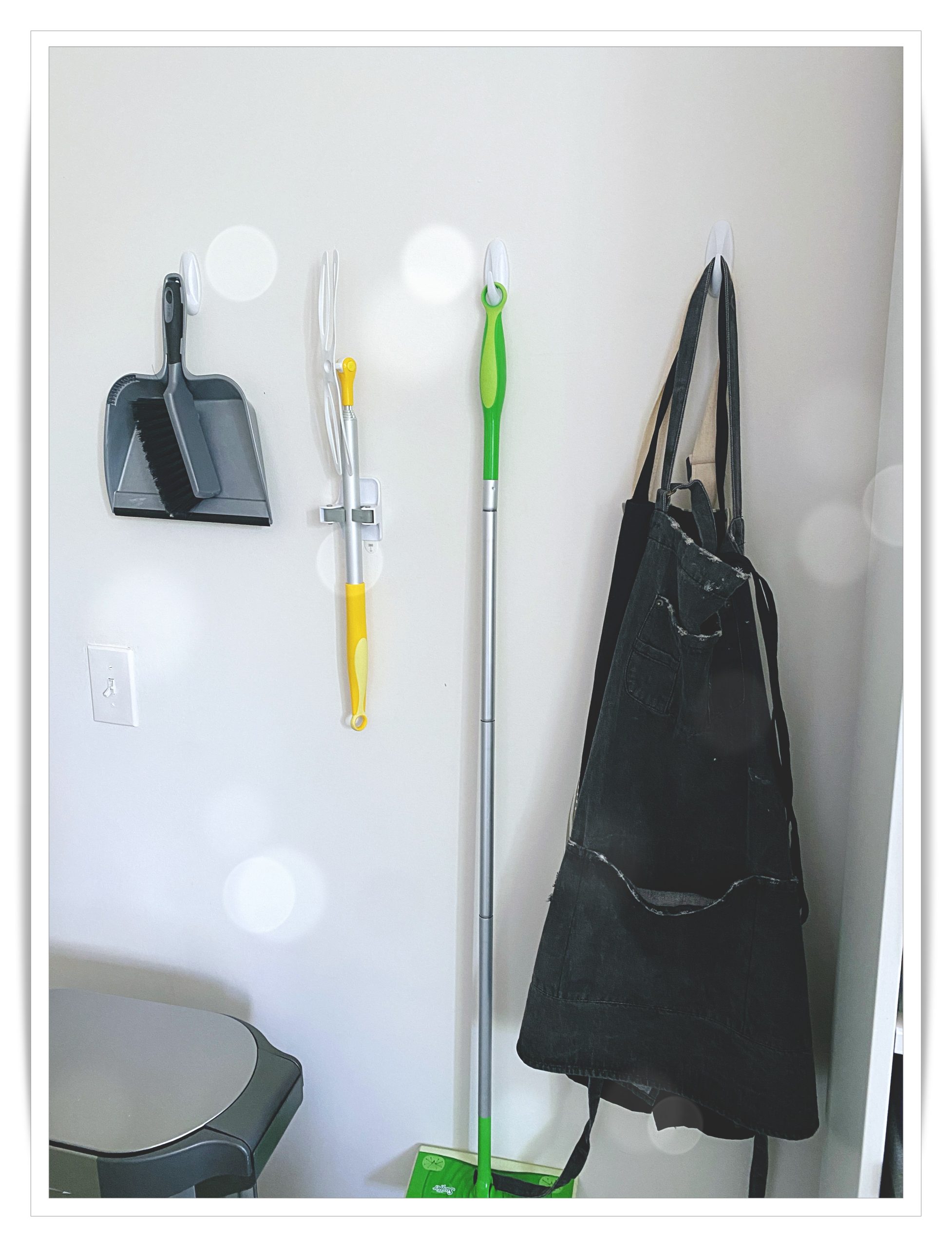 We all have them because they’re a necessity—your Swifter, your duster, your broom, etc. Mine usually hang near the kitchen, but lately, they’ve just been left wherever they were last used, so I made it a point to use my last remaining Command hook, add one more to the row, and now everything hangs nice and neat.