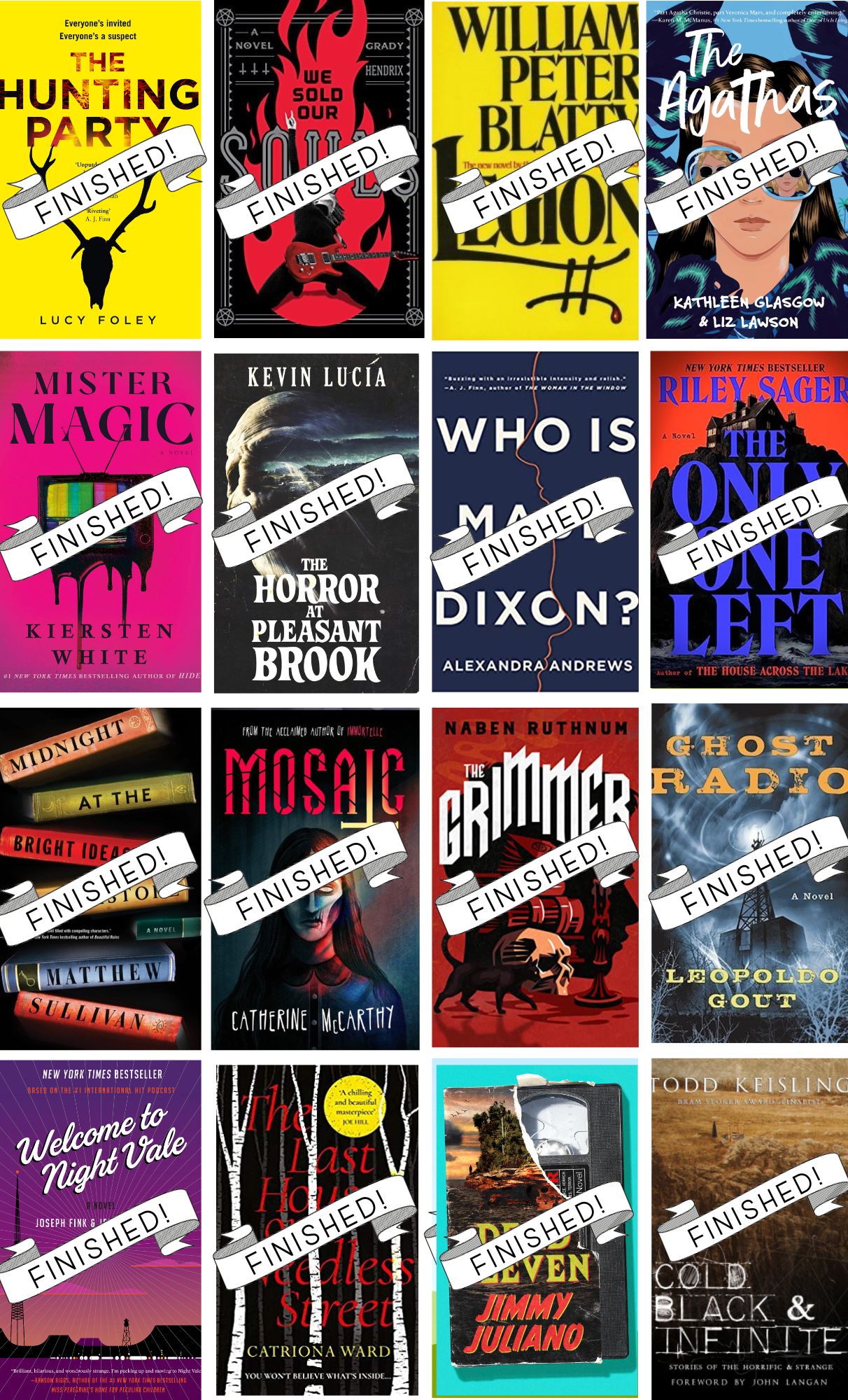 I’ve definitely slowed down the pace, and I’ll finish this year with a total of 35 books, with maybe one extra. I’m currently reading Kill River by Cameron Roubique. I’ve finished The Only One Left by Riley Sager, Mosaic by Catherine McCarthy, and The Horror at Plesant Brook by Kevin Lucia.