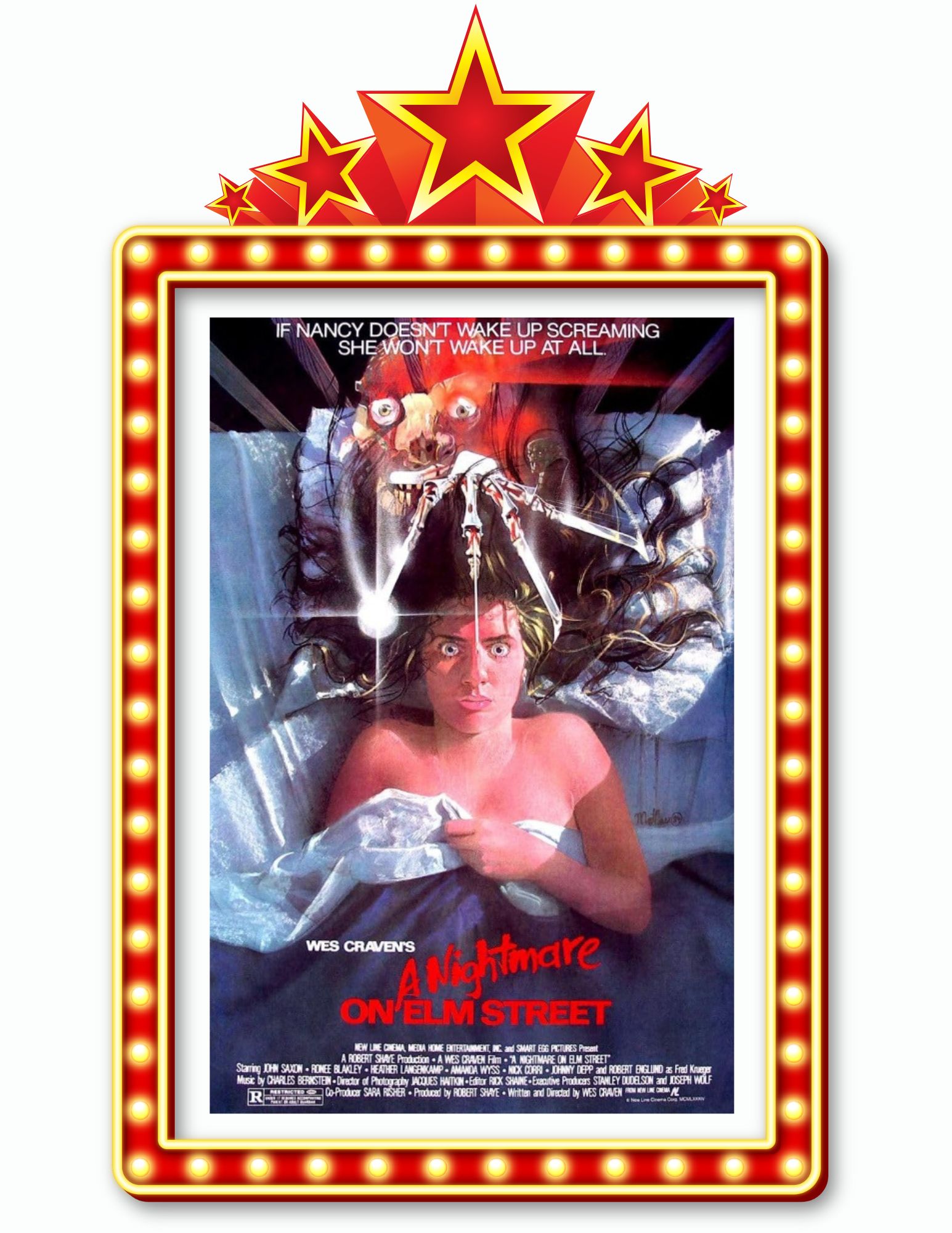 In Wes Craven’s classic slasher film (1984), several Midwestern teenagers fall prey to Freddy Krueger (Robert Englund), a disfigured midnight mangler who preys on the teenagers in their dreams — which, in turn, kills them in reality. After investigating the phenomenon, Nancy (Heather Langenkamp) begins to suspect that a dark secret kept by her and her friends’ parents may be the key to unraveling the mystery, but can Nancy and her boyfriend Glen (Johnny Depp) solve the puzzle before it’s too late?
