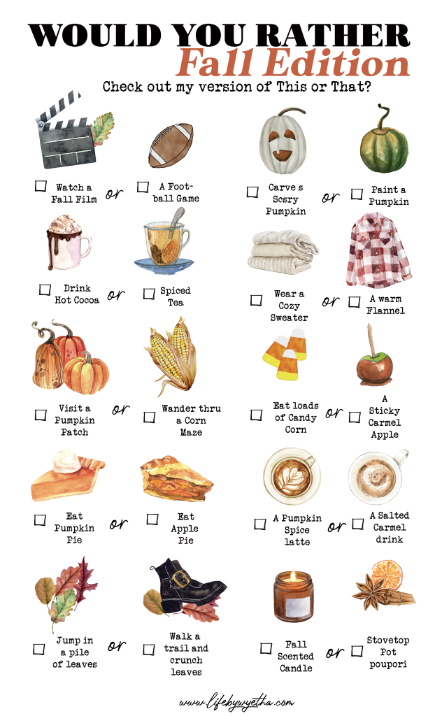 I created this printable about five years ago, and it’s been through several revisions. It’s the older version that’s popular on Pinterest. I’ve tried to link readers to an updated one, but change is hard. (LOL) See my free This or That printable below. It’s great for middle schoolers and up.