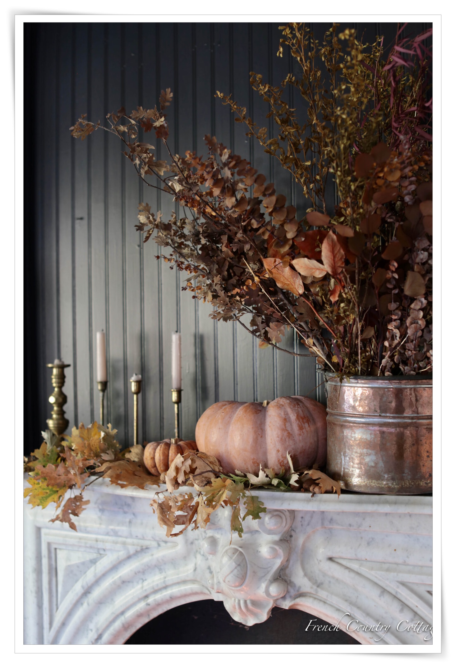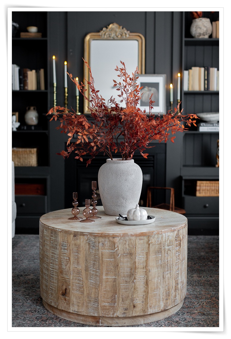 I love these muted tones and colors and could do style in my home year-round. The only difference for me is the faux stems, real pumpkins, and many blackbirds.