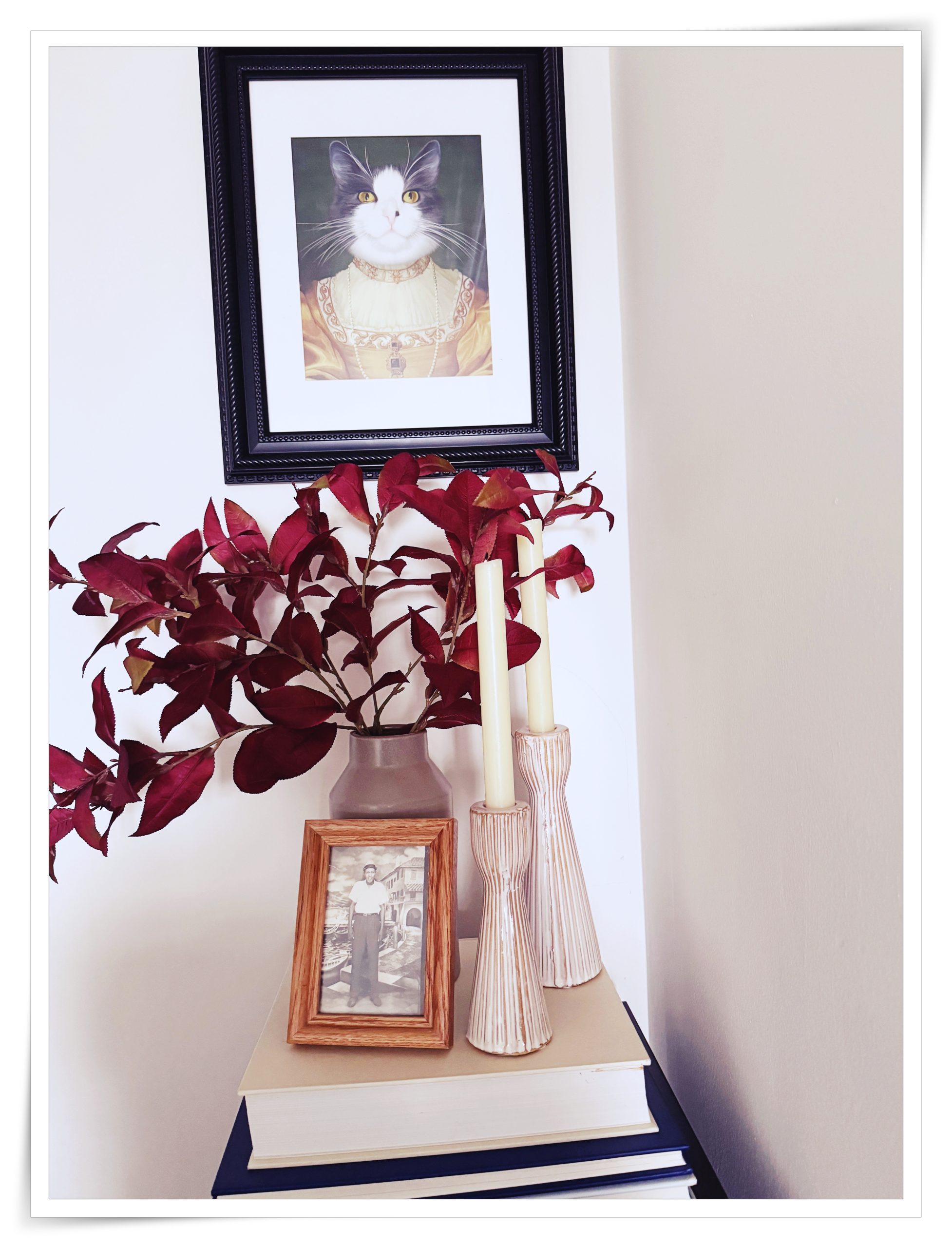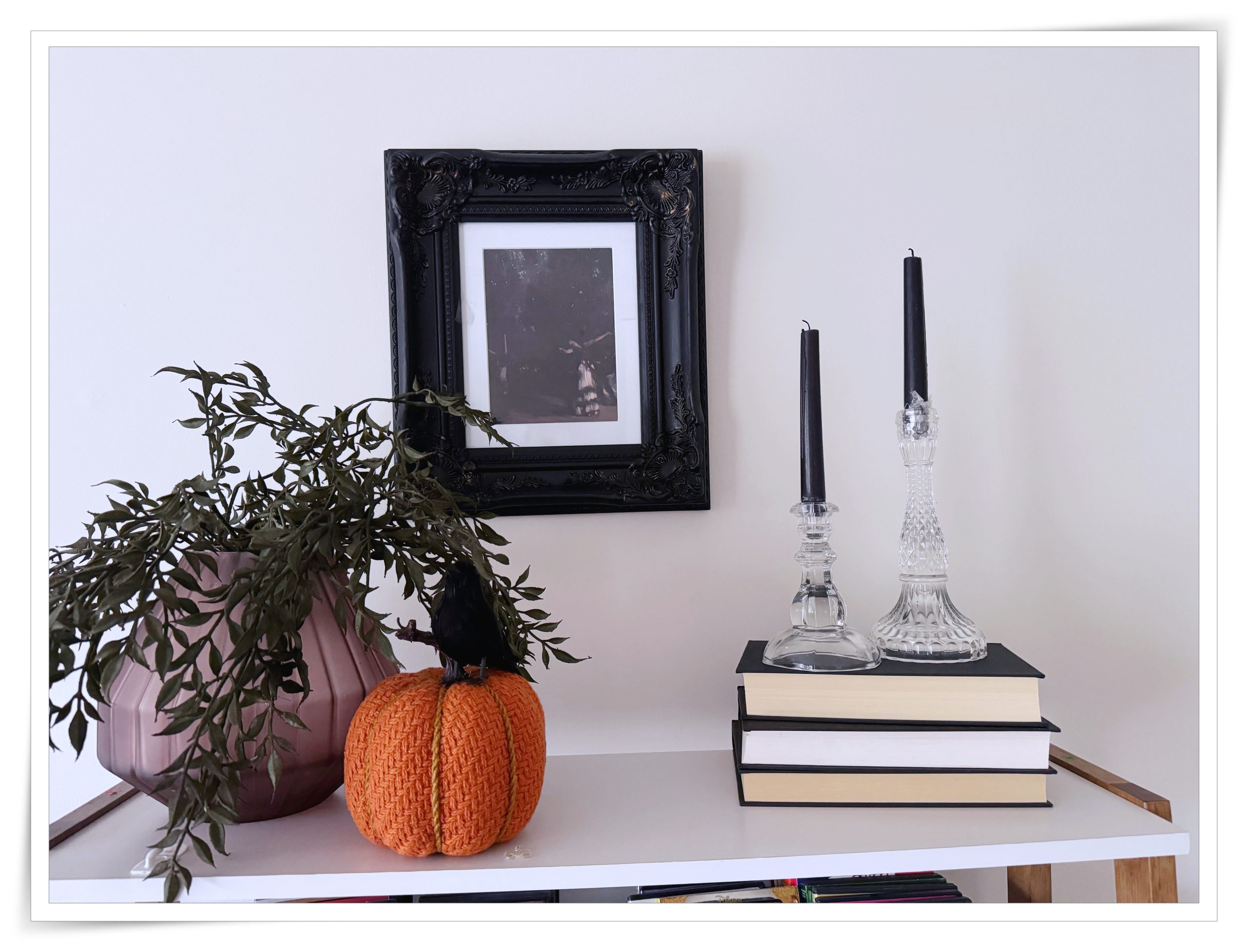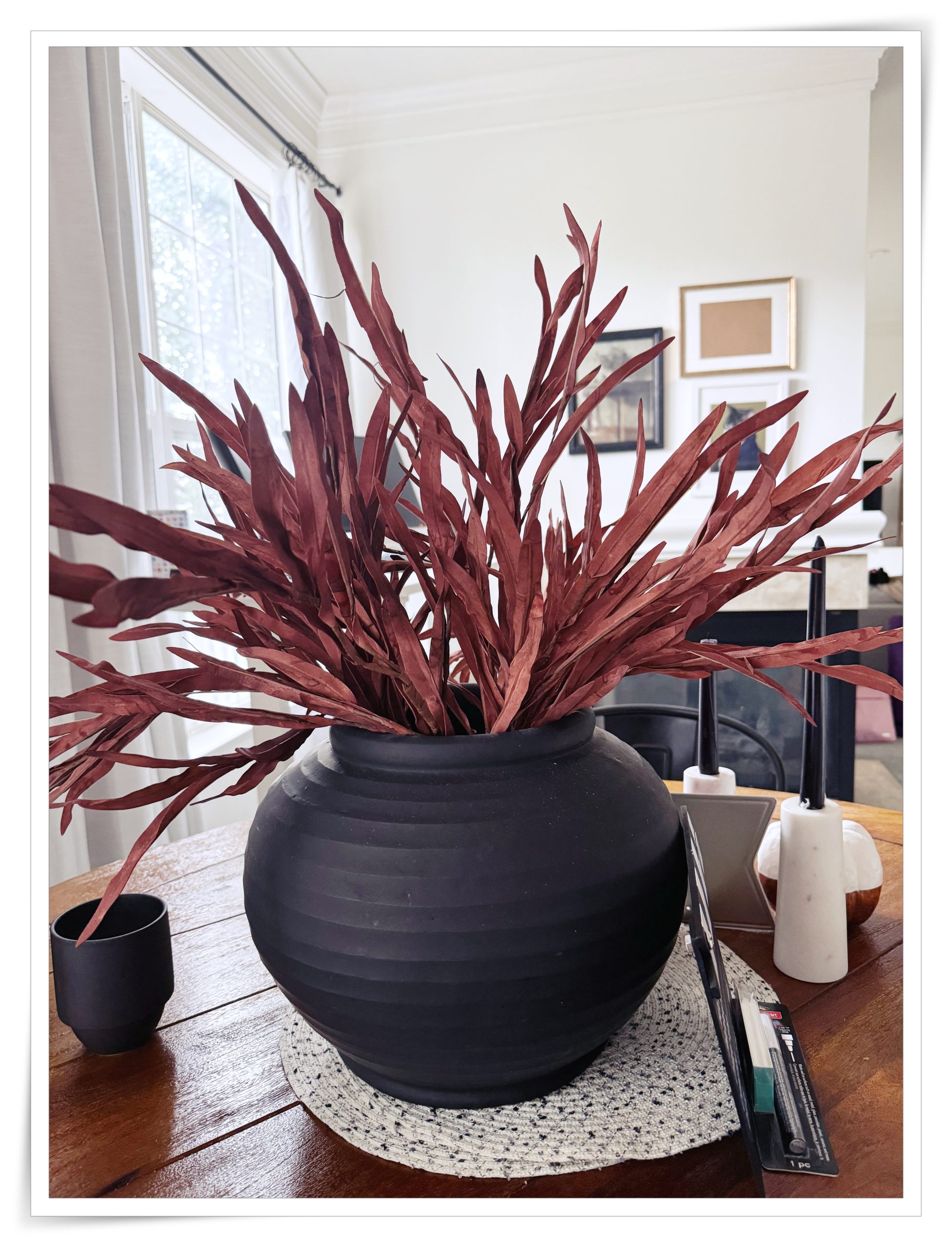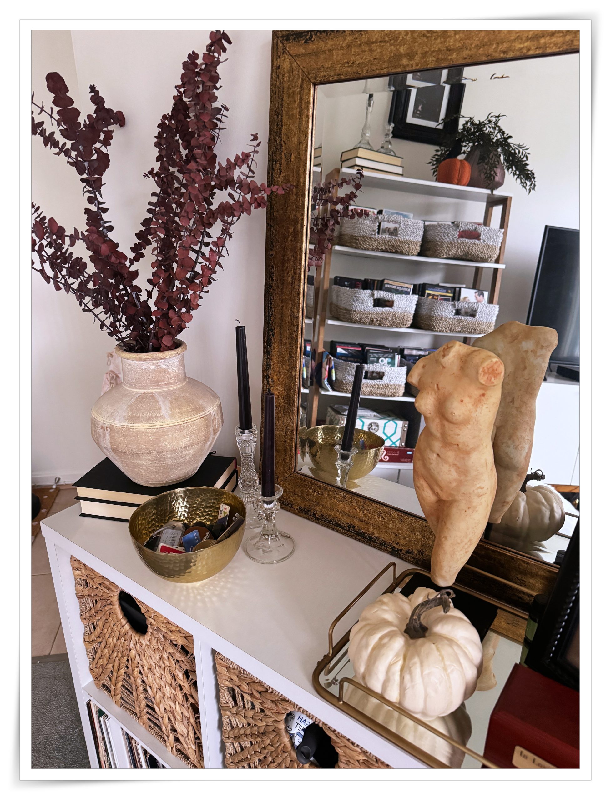 I promised myself that I would not do any frivolous spending because I’m working hard to clear some debt and get my finances in shape, which means the few candles and faux stems I purchased are a wrap for me this season. I’ll probably get some pumpkins; otherwise, it’s a no-spend time for me.