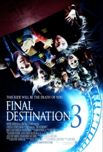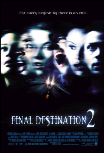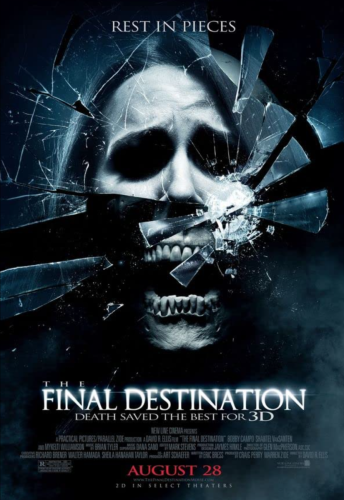 ABOUT: If you have a premonition that you’re going to die, you may as well let it happen because Death is going to get you one way or another, and it’ll probably be painful. The “Final Destination” movies are slashers of sorts with a most unusual villain: Death itself. (You see), Death has a plan, and interrupting the plan will only buy you a little time before Death returns with a vengeance. The franchise has made its name with elaborate “accidents” by which Death claims its victims. (Source: https://www.liveabout.com/)