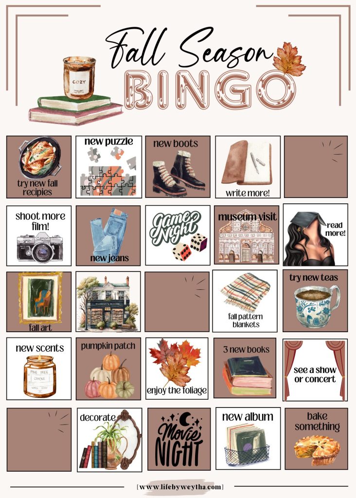 I created this “Fall” inspired bingo with a “Wish-List” mentality. It’s not necessarily completing a straight or a diagonal to win, but more of a check-off list of things you can do to make the season more memorable. This year, I’ve built in some blank spaces so you can write in what you’d like. — Enjoy